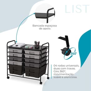 A estrutura em metal cromado garante durabilidade e um visual moderno. Os rodízios com travas oferecem mobilidade total e segurança ao travar o carrinho no lugar, criando uma estação de trabalho firme e prática. Diferenciais: