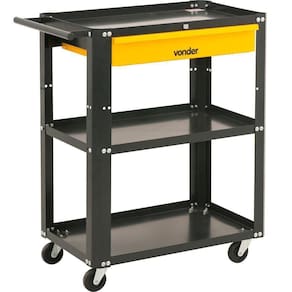 DETALHES DO carro feramenta desmontavel com gaveta vonder: Indicado para transporte de ferramentas e afins. Possui alça para empurrar/puxar, 4 rodízios de 3, 2 fixos e 2 giratórios e 1 gaveta metálica com fechamento para cadeado. Capacidade de carga do carrinho para ferramentas: 80kg
