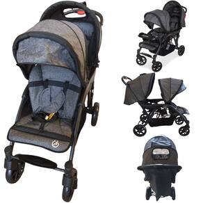 Doppio II possui sistema de fechamento com apenas uma mão, encosto regulável com 3 posições de reclinação, bandeja removível, rodas removíveis, sistema único de freio, amplo cesto porta objetos, capotas retráteis, visor na capota traseira e trava de fechamento.