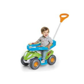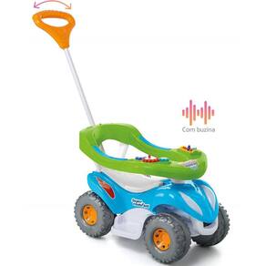 Para a diversão ficar ainda mais completa, basta retirar a proteção e o apoio para os pés, o volante gira e a criança desenvolve os movimentos e a coordenação, dando impulso.