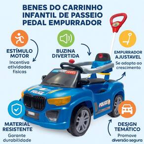 BM Car – Azul – Police Ref.: 3180Idade recomendada: +12 mesesSuporta até: 30 kgSelo INMETRO: 007281/2021 Prepare-se para viver intensas e emocionantes aventuras com o BM Car Police!A imaginação vai rolar solta, seja no passeio ou na brincadeira. Perfeito para acompanhar o crescimento da criança em duas fases: 2 Formas de Uso: +12 Meses – Passeio Assistido: