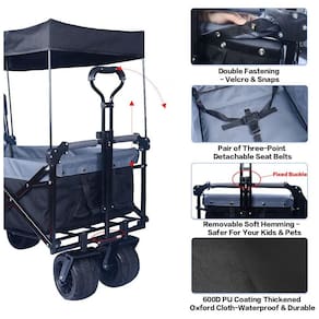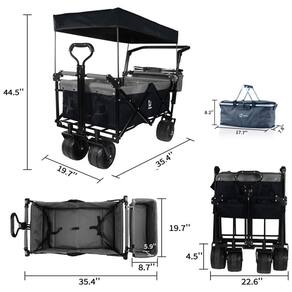 Quando dobrado, o carrinho tem um tamanho de aproximadamente 76 x 61 x 20 cm e um peso de aproximadamente 15,74 quilos. A alça telescópica é ajustável e pode ser estendida até 101 cm, proporcionando uma alça ajustável de 180 graus, permitindo que você empurre ou puxe o carrinho com facilidade. O carrinho também possui um cesto traseiro de 50 x 16 x 22 cm, uma bolsa térmica portátil à prova de vazamentos que mantém o frio por até 34 horas, muitos bolsos internos de armazenamento, um par de tiras de segurança de três pontos e um dossel removível que oferece proteção solar e à prova de chuva.