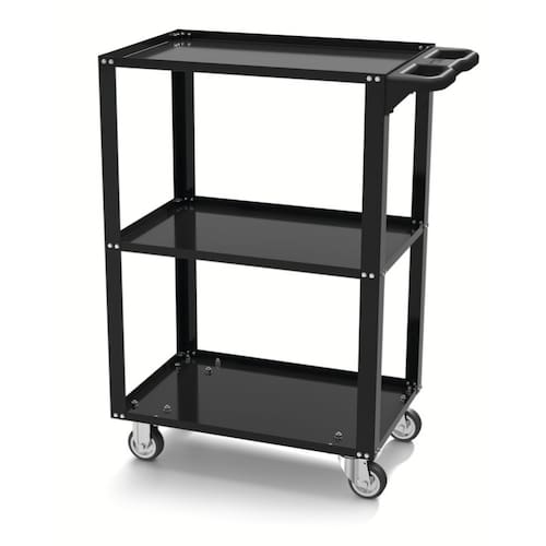 Carro Aberto Desmontável para Ferramentas Tramontina PROOs organizadores modulares da Tramontina PRO permitem mobiliar oficinas mecânicas e concessionárias de forma personalizada. São diversas opções de móveis totalmente fabricados no Brasil e divididos em armários, painéis, bancadas, estantes e carros de ferramentas, que vão deixar o ambiente de trabalho mais bonito, organizado, seguro e ágil, pois cada ferramenta terá o seu lugar. O Carro Aberto Desmontável para Ferramentas Tramontina PRO possui estrutura com paredes reforçadas. Além disso, o produto é desmontável o que torna a sua embalagem compacta, otimizando o transporte. Porque não basta ter a ferramenta certa, é preciso ter ela sempre à mão. Estrutura com paredes reforçadas. Três bandejas. Rodas dianteiras fixas em plástico com 80 mm de diâmetro. Rodas traseiras giratórias em plástico com 80 mm de diâmetro. Capacidade estática: 150 kg; Capacidade dinâmica: 80-100 kg. Espessura das chapas: 0,9 mm. Puxador injetado em plástico na cor preta. Pintura eletrostática na cor preta. Produto desmontado, embalagem compacta. Sempre utilizar óculos de segurança para proteger os olhos. Utilizar luvas para proteger as mãos. Não colocar peças muito altas sobre carrinhos, pois elas caem facilmente durante sua movimentação. Manter o chão do local de trabalho limpo, evitando que as rodas dos carrinhos batam ou passem sobre obstáculo, causando a queda de algo que está sobre o carrinho, ou do próprio. Não sobrecarregar os carrinhos com peso excessivo.