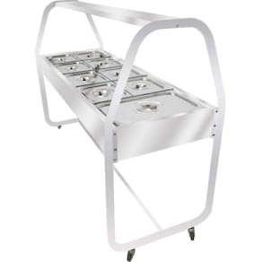 O corpo deste buffet móvel é confeccionado em aço inoxidável 430 e sua estrutura é tubular 01.1/2 curvado em máquina especial com estrutura cromada, proporcionando muito mais durabilidade e resistência ao equipamento. Suas cubas são confeccionadas em aço inoxidável modelo 1/2, de acordo com o padrão mundial gastronorm e as tampas das cubas estampadas em aço inox. Conta com 10 cubas para o aquecimentos dos alimentos, rodízios com trava para evitar o deslocamento do equipamento durante o uso, Além de um termostato que vai de 20C a 80C para que você possa controlar a temperatura conforme a necessidade de uso.
