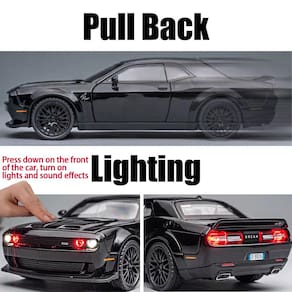 1. O tamanho deste modelo de carro de brinquedo de 15,8 × 6,8 × 4,8 cm é Dodge Challenger Hellcat. Ele pode brilhar, soar e recuar. Se você abrir a porta ou pressionar a frente do carro, você pode ativar o som e flash? - Material: Corpo de metal com peças de plástico, pneus de borracha, acabamento interno e externo detalhado. Tamanho: 6,22 × 2,6 × 1,88 (polegadas), peso: 0,52Ib - Modelos de carros de brinquedo de alta qualidade: o modelo de carro é perfeito para meninos obcecados por esquivas. Carro de brinquedo abrindo portas e compartimento do motor, o modelo de carro tem peças móveis, luzes e capô abertos para ver o motor. - Função: Modelo de carro, som e luz do motor. Pressione as duas rodas do carro dianteiro para acionar o som e as luzes do motor e abra a porta para acionar as luzes dianteiras e traseiras. Coloque o carro no chão, segure o corpo do carro e puxe-o para trás, o modelo de carro irá avançar. - Brinquedos de carro para crianças: embalagem requintada, funções interessantes, materiais sólidos, adequados para presentes de Natal e aniversário. Com uma coleção de lembranças para amigos e familiares. Pode ser exibido para aumentar a beleza e apreciação. - Material: o carro de brinquedo Dodge Challenger Hellcat feito de liga de zinco e excelente material ABS, pneu de borracha, é mais forte e mais resistente à queda do que o plástico comum. Acabamento interno e externo detalhado. É feito de tinta à base de água não tóxica, por isso não contém formaldeído e qualquer outro prejudicial