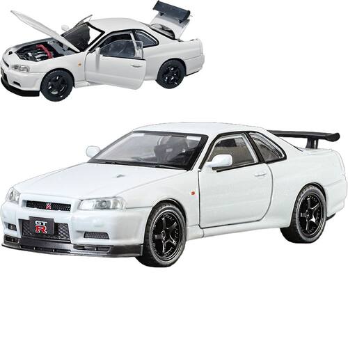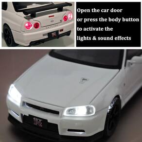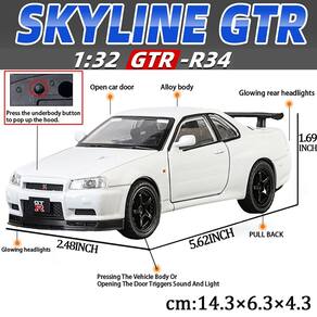 / - Nissan Skyline GTR R34 escala 1: 32 modelo de carro: Tamanho: 14,3 x 6,3 x 4,3 cm. O tamanho certo para os pequenos pegarem. É feito de tinta à base de água não tóxica, por isso não contém formaldeído e outros carros prejudiciais para crianças de 3 a 5 anos. - Modelos de carros de brinquedo de alta qualidade: o modelo de carro é perfeito para meninos obcecados por Nissan Skyline GTR R34. Carro de brinquedo abrindo portas e compartimento do motor, o modelo de carro tem peças móveis, luzes e capô abertos para ver o motor. - Função: Modelo de carro, som e luz do motor. Pressione as duas rodas do carro dianteiro para acionar o som e as luzes do motor e abra a porta para acionar as luzes dianteiras e traseiras. Coloque o carro no chão, segure o corpo do carro e puxe-o para trás, o modelo de carro irá avançar. - Brinquedos de carro para crianças: embalagem requintada, funções interessantes, materiais sólidos, adequados para presentes de Natal e aniversário. Com uma coleção de lembranças para amigos e familiares. Pode ser exibido para aumentar a beleza e apreciação. - Ciência do material: Feito de materiais duráveis, como metal fundido e pneus de borracha premium.