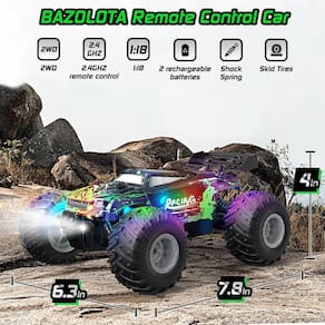 Carro de controle remoto BAZOLOTA, carros RC todo-terreno em escala 1:18, 2WD 20km/h com luz LED colorida e duas baterias recarregáveis, brinquedos Monster Truck Off Road Racing Car com controle remoto para crianças e meninos 1:18 Design interessante: este brinquedo de controle remoto é equo com motores escovados de alta qualidade e a velocidade máxima pode chegar a 20 km/h. O caminhão de brinquedo tem faróis piscando e a carroceria tem luzes coloridas. Muito iluminado à noite, facilitando a localização de seu próprio brinquedo entre seus amigos. Este brinquedo para crianças de 5 a 7 anos só precisa operar o volante e o gatilho, o que é fácil de controlar. As crianças também podem operá-lo com facilidade e habilidade. Jogo sem interferência: Este monster truck de controle remoto está equo com um controle remoto sem interferência de 2,4 GHz. Quando você corre com outros carros de brinquedo, seu caminhão RC não receberá nenhuma interferência. É equo com duas baterias recarregáveis de 600mah, que podem ser s por muito tempo. Este brinquedo para meninos pode ser controlado de longa distância para que você possa aproveitar a diversão da corrida à distância. Design robusto e anticolisão: o invólucro é feito de material de PVC macio, que tem forte tenacidade e pode ser dobrado, mas não é facilmente deformado. O chassi é feito principalmente de material rígido ABS, que tem forte resistência ao impacto físico e não é facilmente danificado mesmo em caso de colisão. O design do pára-choque anticolisão na frente e na traseira pode proteger melhor o caminhão com controle remoto. Aplicável a vários terrenos: as quatro rodas do carro RC off-road ao ar livre são equas com amortecedores de mola, que podem amortecer a força de rebote do carro quando você o dirige em vários terrenos acidentados. Os pneus de borracha de padrão grande podem fornecer atrito adequado ao dirigir em ladrilhos ou outros terrenos escorregadios, garantindo que o carro com controle remoto não escorregue nas superfícies do piso de sua casa. Brinquedos para meninos e animais de estimação: se você tem um cachorro de estimação, pode operar o carro com controle remoto para atrair sua atenção, deixá-lo correr e brincar com você. Se seu filho for relativamente jovem, isso também pode atrair sua atenção e cultivar os hobbies infantis. Este carro de controle remoto para crianças é um presente divertido que trará alegria para crianças e animais de estimação.