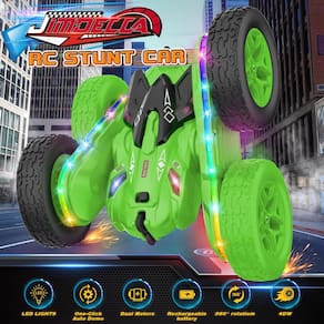 Jimdella Carro de controle remoto feito de materiais de alta qualidade e vem com acessórios ricos, incluindo: 1 carro RC, 1 controle remoto, 2 baterias recarregáveis de 500 mA, 2 pilhas AA, 4 rodas sobressalentes, 1 chave de fenda, 10 parafusos, 1 número de instruções de uso. Design exterior bem trabalhado. melhores presentes para meninos 8-12 presentes de aniversário - Carro RC AMBILIGHT - O carro RC Jimdella adota um design exclusivo de iluminação de roda. 26 luzes LED na carroceria do carro emitem luzes semelhantes a arco-íris, adicionam uma sensação de dinamismo e modernidade ao carro. Quando as crianças estão dirigindo ao ar livre, as luzes LED formarão uma linda pista de arco-íris, criando visuais deslumbrantes. O carro de acrobacias RC tem uma função de demonstração automática. Pressione o botão de demonstração para mostrar automaticamente performances incríveis de acrobacias, permitindo que as crianças mergulhem em festas divertidas e visuais de condução. - [Carro RC DIY forte e resistente] - O carro de controle remoto Jimdella é feito de plástico ABS forte e não tóxico, todo o carro é formado integralmente com uma estrutura forte, equipado com pneus de borracha duráveis anticolisão com absorção de choque, portanto, condições adversas não impedirão as crianças de sua aventura de corrida! Temos quatro pneus sobressalentes que podem ser substituídos, para que as crianças possam fazer você mesmo livremente seu próprio carro, as crianças podem mergulhar totalmente na aventura de corrida. melhores brinquedos para idades de 5 a 7 anos - Bateria dupla e super vida útil da bateria: o carro de controle remoto Jimdella vem com 2 peças de bateria recarregável de 500mA e cabo de carregamento USB – cada bateria pode funcionar por 30 minutos, você pode carregá-la facilmente em qualquer lugar com um adaptador, computador, carregador portátil. As crianças têm menos tempo de inatividade e garantem que você. A emoção dos pequenos pilotos continua enquanto eles se preparam para sua próxima aventura. Também incluímos duas baterias AA de 1,5 V para o controle RC, para que as crianças possam se divertir com o carro RC. - [Motores duplos de alto desempenho] - O carro RC de dupla face está equipado com 2 motores potentes sem escovas, que têm potência mais forte, velocidade máxima de até 15 km/h e uma forte capacidade de escalada, deixando você muito à frente na competição com seus amigos. Nosso controle remoto sem interferência de 2,4 GHz está equipado com tecnologia antiinterferência avançada para evitar interferência de sinal, proporcionando uma conexão perfeita entre o controle remoto e o carro. Controle preciso do seu carro mesmo no modo multijogador - [Carro de acrobacias de controle remoto JIMDELLA]-360 Flips Rotating Stunt RC Cars suporta uma variedade de acrobacias. Você pode usar o controle para controlar o carro para frente, para trás, para a esquerda, para a direita, rotação e rotação de 360 graus, trazendo diversão ilimitada. Ambos os lados dos carros RC estão equipados com faróis coloridos e faixa de luz colorida, que pode ser ligada e desligada livremente através do controle remoto.