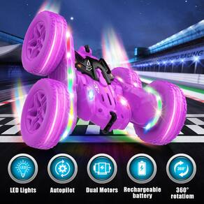 Jimdella Carro de controle remoto feito de materiais de alta qualidade e vem com acessórios ricos, incluindo: 1 carro RC, 1 controle remoto, 2 baterias recarregáveis de 500 mA, 2 pilhas AA, 4 rodas sobressalentes, 1 chave de fenda, 10 parafusos, 1 número de instruções de uso. Design exterior bem trabalhado. melhores presentes para meninos 8-12 presentes de aniversário - Carro RC AMBILIGHT - O carro RC Jimdella adota um design exclusivo de iluminação de roda. 26 luzes LED na carroceria do carro emitem luzes semelhantes a arco-íris, adicionam uma sensação de dinamismo e modernidade ao carro. Quando as crianças estão dirigindo ao ar livre, as luzes LED formarão uma linda pista de arco-íris, criando visuais deslumbrantes. O carro de acrobacias RC tem uma função de demonstração automática. Pressione o botão de demonstração para mostrar automaticamente performances incríveis de acrobacias, permitindo que as crianças mergulhem em festas divertidas e visuais de condução. - [Carro RC DIY forte e resistente] - O carro de controle remoto Jimdella é feito de plástico ABS forte e não tóxico, todo o carro é formado integralmente com uma estrutura forte, equipado com pneus de borracha duráveis anticolisão com absorção de choque, portanto, condições adversas não impedirão as crianças de sua aventura de corrida! Temos quatro pneus sobressalentes que podem ser substituídos, para que as crianças possam fazer você mesmo livremente seu próprio carro, as crianças podem mergulhar totalmente na aventura de corrida. melhores brinquedos para idades de 5 a 7 anos - Bateria dupla e super vida útil da bateria: o carro de controle remoto Jimdella vem com 2 peças de bateria recarregável de 500mA e cabo de carregamento USB – cada bateria pode funcionar por 30 minutos, você pode carregá-la facilmente em qualquer lugar com um adaptador, computador, carregador portátil. As crianças têm menos tempo de inatividade e garantem que você. A emoção dos pequenos pilotos continua enquanto eles se preparam para sua próxima aventura. Também incluímos duas baterias AA de 1,5 V para o controle RC, para que as crianças possam se divertir com o carro RC. - [Motores duplos de alto desempenho] - O carro RC de dupla face está equipado com 2 motores potentes sem escovas, que têm potência mais forte, velocidade máxima de até 15 km/h e uma forte capacidade de escalada, deixando você muito à frente na competição com seus amigos. Nosso controle remoto sem interferência de 2,4 GHz está equipado com tecnologia antiinterferência avançada para evitar interferência de sinal, proporcionando uma conexão perfeita entre o controle remoto e o carro. Controle preciso do seu carro mesmo no modo multijogador - [Carro de acrobacias de controle remoto JIMDELLA]-360 Flips Rotating Stunt RC Cars suporta uma variedade de acrobacias. Você pode usar o controle para controlar o carro para frente, para trás, para a esquerda, para a direita, rotação e rotação de 360 graus, trazendo diversão ilimitada. Ambos os lados dos carros RC estão equipados com faróis coloridos e faixa de luz colorida, que pode ser ligada e desligada livremente através do controle remoto.