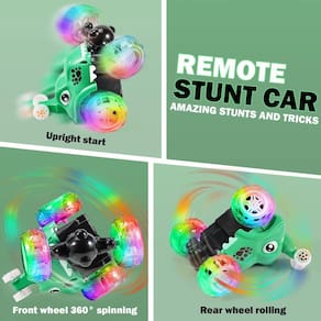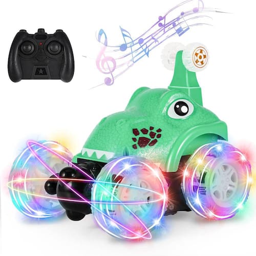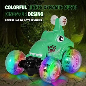 - Carro RC de dinossauro que faz acrobacias! - Este carro de controle remoto vem com aparência de dinossauro fofo com luzes cintilantes e música dinâmica, que atrai bebês e crianças facilmente. Além disso, ele pode correr e realizar uma rotação rolante de 360 graus. Ótimos brinquedos infantis para permitir que meninos e meninas desfrutem de um maravilhoso show de carros e diversão.