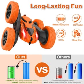 4WD 2,4 GHz Full Functional RC Stunt Toy Car - Racing RC Car Cool Gift for Kids - Liberte o motorista de acrobacias interiores: nosso carro de acrobacias RC é projetado para crianças que amam aventura e emoção! Pode cair e virar a 360 graus e dirigir em ambos os lados, o que oferece uma experiência emocionante e única para crianças e até mesmo adultos. Com desempenho em todos os terrenos, nosso carro de controle remoto pode lidar com vários terrenos, incluindo areia, gramado, estrada de pedra e muito mais, tornando-o perfeito para levar suas acrobacias e corridas onde você quiser. - Diversão de longa duração: com bateria atualizada de 1400 mAh, nosso carro de controle remoto pode fornecer até 90 minutos de ação sem parar com uma única carga, dando a você bastante tempo para aperfeiçoar suas acrobacias e impressionar seu público. Então, pegue seu controle remoto e prepare-se para ultrapassar os limites com nossos carros RC de longa duração e emocionantes! - Controles fáceis e sem interferência: com a tecnologia avançada de longa distância e anti-interferência do nosso rastreador rc, você pode correr com vários carros ao mesmo tempo sem qualquer interrupção, proporcionando uma experiência perfeita e agradável para crianças e adultos. Além disso, o controle remoto usa 2 pilhas AA (não incluídas) e é fácil de usar, tornando-o perfeito para crianças a partir de 6 anos de idade operarem e se divertirem. - Seguro e durável: feito com plástico ABS de alta qualidade e equipado com uma estrutura estável e elementos eletrônicos de alta classe, foi exaustivamente testado para garantir que seja seguro para as crianças usarem. A bateria também é fácil de remover e recarregar, para que você possa ficar tranquilo sabendo que seu filho está brincando com um brinquedo seguro e confiável. - Ideia de presente perfeita: procurando um presente divertido e prático? Não procure mais, nosso carro de acrobacias RC! É uma maneira fantástica de incentivar brincadeiras ao ar livre e ajudar as crianças a desenvolver suas habilidades motoras e coordenação olho-mão, tudo isso enquanto se divertem. Seja para um aniversário, feriado ou apenas porque, nosso Stunt Car é o presente perfeito para qualquer pessoa que busca emoções em sua vida.