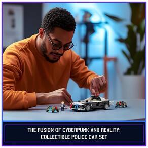 Conjunto de blocos de montar em plástico que representa um carro de patrulha policial em estilo cyberpunk, com perfil baixo, linhas inspiradas em muscle cars e acabamento voltado para cenas de perseguição em cidade futurista. A carroceria reúne para-choques robustos, linha lateral contínua e teto rebaixado, adequado para exibição em cenários urbanos de ficção científica.?