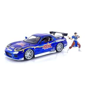 - Conjunto colecionável 2 em 1 com um carro die-cast Mazda RX-7 1993 na escala 1:24 e uma figura de 7 cm da Chun-Li inspirada na icônica franquia Street Fighter.
