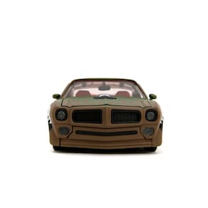 Este modelo meticulosamente elaborado na escala 1:24 do Pontiac Firebird 1972 oferece uma combinação impressionante de autenticidade e apelo colecionável. Feito inteiramente em metal die-cast, o modelo possui uma construção robusta complementada por pneus de borracha premium que realçam seu visual e toque realistas. A pintura verde primer exclusiva é destacada por gráficos marcantes inspirados no estilo militar, incluindo dentes de tubarão e decalques de estrela, conferindo a este muscle car uma estética ousada e agressiva.