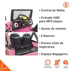 CARACTERÍSTICAS - Idade Recomendada: A partir de 3 anos - Suporta até 25 kg - 2 Bancos - Possui cinto de segurança - Central de Mídia - Faróis de LED - Controle Remoto 2.4G RC - Espaço Bagageiro - Suspensão nas 4 Rodas - Possui 4 rodas antichoque. - Bateria de 12V recarregável - Produz luz e som - Entrada USB para MP3 player - Ajuste de volume - Anda de frente e marcha ré - Decorada com lindos adesivos - Aprovada pelo INMETRO