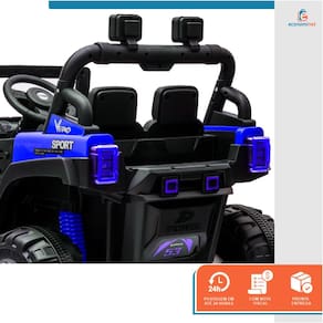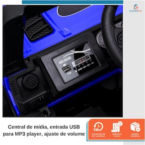 - 2 Bancos - Possui cinto de segurança - Central de Mídia - Faróis de LED - Controle Remoto 2.4G RC - Espaço Bagageiro - Suspensão nas 4 Rodas - Possui 4 rodas anti choque - Bateria de 12V recarregável - Produz luz e som - Entrada USB para MP3 player - Ajuste de volume - Anda de frente e marcha ré - Decorada com lindos adesivos - Aprovada pelo Inmetro