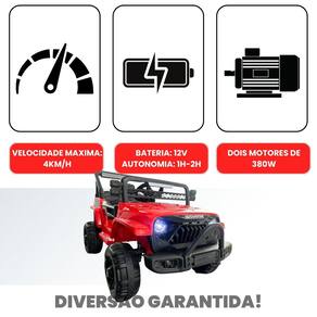 Especificações Técnicas: - Modelo Jeep Rubicon - Dimensões (C x L x A) 96 cm x 59 cm x 57 cm - Peso Suportado Até 30 kg - Peso do Produto 12 kg - Bateria 2 baterias de 6V (12V no total) - Potência Total 720W