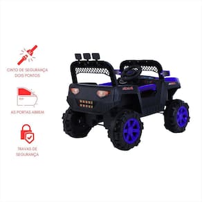 -bateria 12v potente -faróis de led multicoloridos -som com entrada usb, aux/p2 e buzina divertida -trava de segurança para proteção extra -marcha ré para manobras radicais
