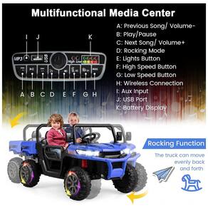 Caminhão de 2 lugares o caminhão basculante de 4 rodas possui 2 assentos e alta capacidade de carga de até 49 kg, o que é capaz de encantar 2 crianças pequenas ao mesmo tempo. Além disso, as funções de música embutida, entrada auxiliar, porta USB e conexão sem fio são muito divertidas. E o modo de balanço traz uma surpresa extra para seus filhos.