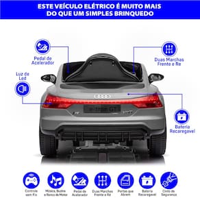 Características Técnicas: - Modelo: Audi E-tron GT Sportback - Dimensões do carro: 40 cm x 56 cm x 115 cm. - Marca: Zippy Toys. - Idade mínima: 3 anos. - Composição: Plástico. - Tempo de Carga: 8- 12 Horas. - Forma de energia: carregamento. - Carregador: 12V1000mA. - Peso suportado: Até 30kg. - Velocidade: 3 a 6 km/h. - Peso aproximado do produto: 30kg. - Controle Remoto: 2 pilhas (não inclusas).