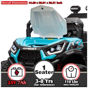 Durabilidade e Capacidade: Fabricado com um corpo de plástico PP durável e certificado pela ASTM F963, o UTV suporta uma carga máxima de 49,89 kg e alcança uma velocidade máxima de até 8 km/h. É um presente ideal para aniversários, Dia de Ação de Graças, Natal, Ano Novo e outras ocasiões especiais.