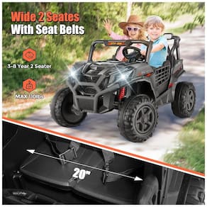 O assento extra largo de 50 cm acomoda facilmente duas crianças de 3 a 6 anos ou uma criança de até 8 anos, com cintos de segurança individuais em cada assento, garantindo proteção e conforto durante a diversão.