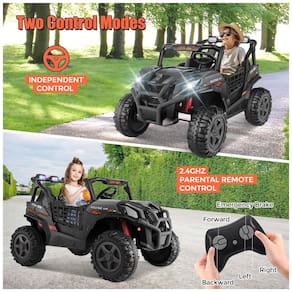 O UTV Hikole de 2 lugares permite que as crianças compartilhem a diversão com amigos, tornando o passeio ainda mais divertido e interativo. Para a segurança adicional, os pais podem utilizar o controle remoto de 2,4 GHz incluído, permitindo controlar totalmente o UTV elétrico de 24V. A partida com um botão facilita o início da aventura, tornando o processo mais simples e emocionante para as crianças.