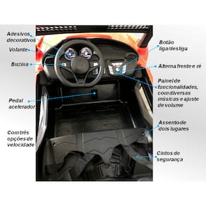De fácil utilização, desenvolve a capacidade motora da criançada, além de ser a maior diversão! Para uso doméstico. Atinge de 3 km/h a 8 km/h em terreno liso e aguenta o peso de duas crianças (ideal para 2 crianças de até 1,20 M, ou seja, em torno de 3 a 5 anos). Possui motor 12V e 1 baterias 12V 7Ah. Acompanha manual do proprietário em português e com imagens e carregador de bateria Bivolt! No quesito segurança, possui plugue para carregar de forma segura sem expor a bateria, fusível de proteção e fiação completamente embutida; possui também todas as especificações previstas em lei e é aprovado pelo Inmetro (certificado nº ABCP-BRI-0259-2021-01). Antes do primeiro uso, conectar a bateria e carregar por 8 horas (não deixar mais do que 8 horas).