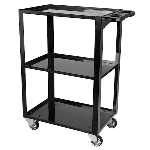 DIFERENCIAIS Estrutura com paredes reforçadas. Três bandejas. Rodas dianteiras fixas em plástico com 80 mm de diâmetro. Rodas traseiras giratórias em plástico com 80 mm de diâmetro. Capacidade estática: 200 kg; Capacidade dinâmica: 100-150 kg Espessura das chapas: 1,2 mm Puxador injetado em plástico na cor preta Pintura eletrostática na cor preta.As maletas, carros e bancadas são testados em ensaios de carga, para garantir sua resistência durante a utilização na oficina ou indústria.A pintura eletrostática forma uma película protetiva que garante um acabamento excelente e resistência à corrosão.As gavetas que estão na linha de carros e bancadas, possuem corrediça tipo telescópica. As corrediças telescópicas garantem deslizamento suave e maior abertura para as gavetas, quando comparadas com corrediças tradicionais.Armazenamento e transporte de ferramentas manuais, peças e acessórios.As ferramentas são produzidas e testadas conforme normas específicas.