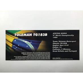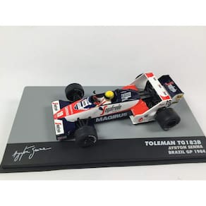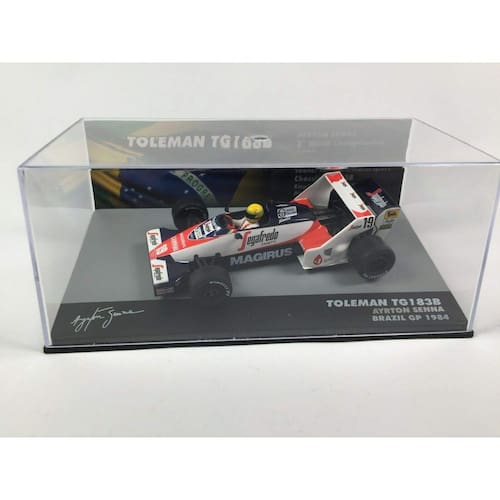 Carro 1/43 F1 TOLEMAN TG183B AYRTON SENNA BRASIL GP 1984 (717) - Escala 1/43 de metal - Carro aparafusado na base e apresentado em uma caixa de acrílico