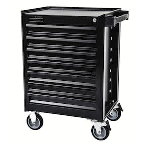 Estrutura com paredes reforçadas. Sete gavetas de 73mm de altura com corrediças telescópicas. Tranca única para todas as gavetas. Rodas dianteiras fixas de plástico com 125 mm de diâmetro. Rodas traseiras giratórias de plástico com 125 mm de diâmetro e freio. Capacidade de carga máxima por gaveta: 30 kg. Capacidade estática: 300 kg.Capacidade dinâmica: 200-250 kg. Espessuras das chapas: 1,20 mm. Pintura eletrostática na cor preta.