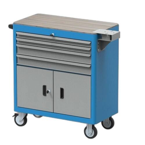 Carrinho para Ferramentas com 4 gavetas e 2 portas é fabricado em chapas de aço carbono resistentes, recebe tratamento de superfície anticorrosivo e finalmente recebe um acabamento de tinta eletrostática a pó.
