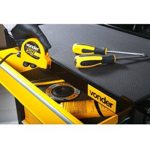 Este carrinho para ferramentas possui estrutura reforçada com 5 gavetas em metal, fechamento com chave, 2 rodízios fixos, 2 rodízios giratórios com freio e alça para movimentação. Conta ainda com gavetas com bases protegidas por tapetes de borracha, evitando a movimentação das ferramentas. Indicado para transporte de ferramentas e afins.