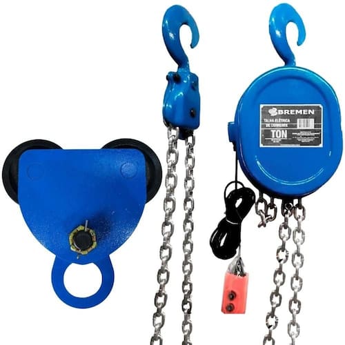 Já a Talha Elétrica 3 TON 8289 Bremen é equipada com motor trifásico de alto desempenho e corrente calibrada em aço zincado, assegurando força, precisão e confiabilidade na elevação de cargas até 3 metros de altura. Seu comando por botoeira facilita a operação, tornando o processo de elevação mais prático e seguro. A combinação desses dois equipamentos resulta em um sistema completo de movimentação vertical e horizontal de cargas, ideal para otimizar o fluxo de trabalho e reduzir riscos operacionais.