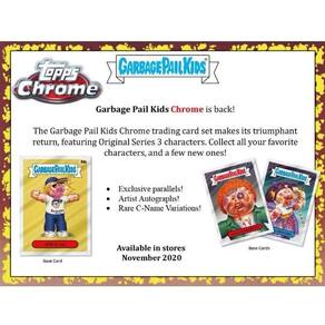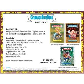 - Cada caixa contém cinco (5) pacotes 2020 Garbage Pail Kids Chrome mais um (1) pacote bônus de violoncelo com três (3) bases Atomic Refractor Parallels.