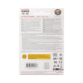 Cartão de memória SanDisk Extreme - Velocidades de disparo de até 40 MB/s*, velocidades de transferência de até 90 MB/s* requerem dispositivos compatíveis capazes de atingir tais velocidades. | *Com base em testes internos; o desempenho pode ser menor dependendo do dispositivo host, interface, condições de uso e outros fatores - Perfeito para gravar vídeo 4K UHD (1) e fotografia em modo de explosão sequencial | (1) O suporte de vídeo Full HD (1920x1080) e 4K UHD (3840 x 2160) pode variar com base no dispositivo host, atributos de arquivo e outros fatores - Capte vídeo ininterrupto com velocidade UHS Classe 3 (U3) e velocidade de vídeo classe 30 (V30)(2) | (2) taxa de captura de vídeo sustentada de 30 MB/s, designa uma opção de desempenho projetada para suportar gravação de vídeo em tempo real com dispositivos host habilitados para UHS - Construído e testado em condições adversas (3): à prova de temperatura, à prova d'água, à prova de choque e à prova de raios X | (3) Apenas cartão