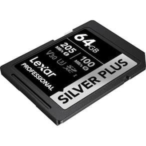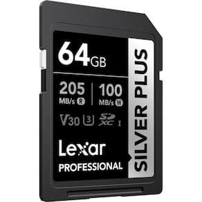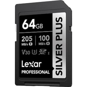 O cartão de memória sdxc uhs-i silver plus profissional de 64 gb da lexar possui uma capacidade de armazenamento de 64 gb e aproveita o barramento uhs-i para oferecer suporte a vídeos full hd e 4k/60p. Ele também é adequado para disparos contínuos, disparos rápidos e capturas raw e jpeg. Este cartão pode atingir velocidades máximas de leitura de até 205 mb/s e velocidades máximas de gravação de até 100 mb/s. Graças à sua classificação de classe de velocidade v30, as velocidades mínimas de gravação são garantidas para não cair abaixo de 30 mb/s.
