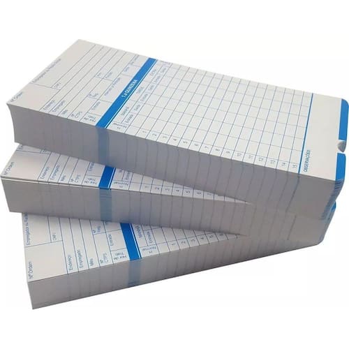 Confeccionado em cartolina fosca de alta qualidade, o cartão possui seis colunas de registro e identificação visual para controle quinzenal, facilitando a gestão da jornada de trabalho. Sua superfície resistente proporciona impressão nítida, evita borrões e prolonga a vida útil da fita do relógio, sendo uma solução econômica e eficaz para o controle manual de ponto.