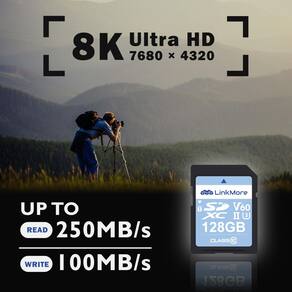 LinkMore XV26 128GB SDXC UHS-II Cartão SD UHS-II, C10, U3, V60, Cartão SD para Câmera Digital, Drone Suporte 4K 8K Vídeo, Cartões de Memória de Câmera até 250MB/s Velocidade de Leitura, 100MB/s Velocidade de Gravação - Armazenamento de alto desempenho: o cartão LinkMore XV26 SDXC UHS-II oferece desempenho de nível superior com velocidade de leitura de até 250 MB/s e velocidade de gravação de 100 MB/s, perfeito para aplicações exigentes. *A taxa de transferência com base em testes internos. O desempenho pode variar dependendo do hardware, software, uso e capacidade de armazenamento do host. - Otimizado para vídeo 4K e 8K: suporta os padrões C10, U3 e V60, garantindo gravação suave e confiável de vídeos 4K e 8K para câmeras digitais e drones. *Certifique-se de verificar os padrões compatíveis e a velocidade de transferência do seu dispositivo compatível com gravação 4K ou 8K. - Ampla compatibilidade: Projetado para uso com câmeras digitais, drones e outros dispositivos que exigem cartões de memória de alta velocidade e alta capacidade. O cartão SD oferece amplo espaço para suas fotos, vídeos e outros dados de alta resolução, garantindo que você nunca fique sem espaço durante momentos críticos. - Robusto e confiável: construído para suportar condições difíceis, o LinkMore XV26 é ideal para fotógrafos e cinegrafistas profissionais que precisam de armazenamento durável e confiável. - Feito em Taiwan. Chips cuidadosamente selecionados garantem confiabilidade, este cartão SD é uma escolha confiável e confiável para quem procura armazenamento de memória de alta qualidade.