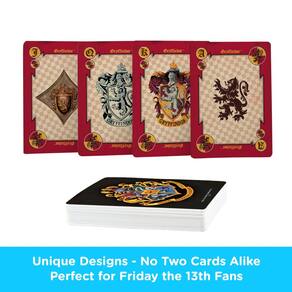 - Lindos designs de cartas: este baralho mágico de cartas inclui 54 cartas com diferentes designs de todas as quatro casas da Escola de Magia e Bruxaria de Hogwarts, incluindo Grifinória, Lufa-Lufa, Corvinal e Sonserina.