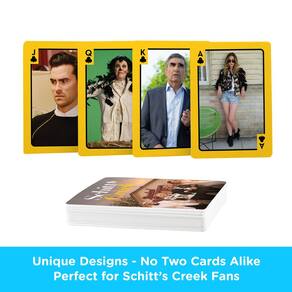- DESIGN EXCLUSIVO EM CADA CARTA: O baralho de cartas Schitt's Creek inclui cartas (52 cartas de baralho e 2 coringas). Cada carta de baralho apresenta seu próprio design e arte temáticos distintos de Schitt's Creek. Não há duas cartas iguais