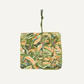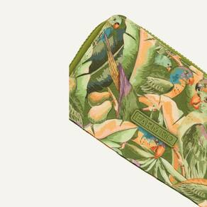Compartimentos internos para cartões, documentos e dinheiro Tamanho compacto que cabe facilmente em bolsas e mochilas Estampa exclusiva Floresta dos Pássaros, alegre e autêntica Fecho seguro que mantém os itens protegidos