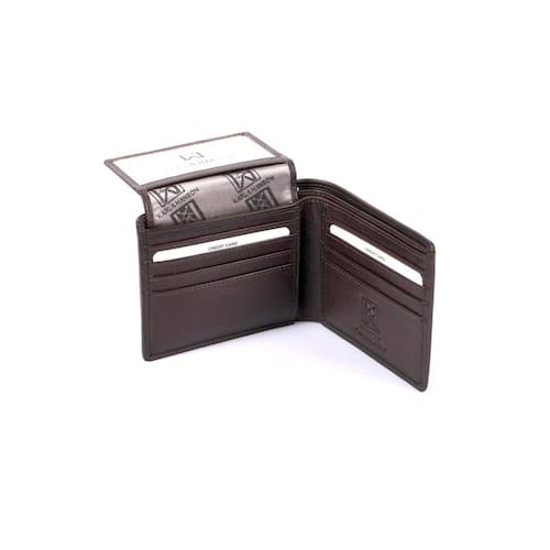 Tamanho da caixa de presente: 11 L x 9 A x 2,2 cm Exterior: couro Interior: poliéster Cores do forro: preto, carteira dupla masculina espresso/1 bolso interno com zíper/2 compartimentos para notas /7 compartimentos para cartões/1 bolso para moedas com aba/protetor de cartão RFID - carteira dupla