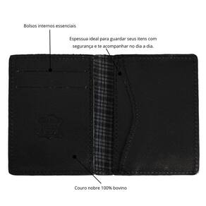 Especificações Técnicas: - Couro Nobre 100% Bovino; - 05 Bolsos internos; - Espaço para cartões de Créditos, Notas e CNH - Forro em Couro Nobre 100% Bovino - Cor Preto - Compacta e Essencial