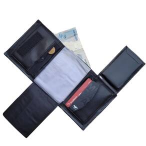 Possui espaço interno organizado, com porta notas, porta documentos, porta cartões, porta níquel e com fechamento em zíper.