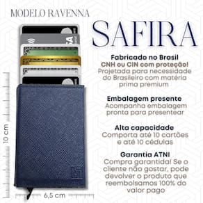 Carteira Porta Cartao Antifurto RFID ATNI Exclusive Ravenna COR: Safira Carteira Ravenna Pedras Preciosas Conheça a nova linha de carteiras Exclusive Ravenna nas versões Rubi e Safira. Inspiradas nas pedras preciosas, essas carteiras oferecem um diferencial exclusivo e marcante Projetadas no Brasil, nossas carteiras são a solução perfeita para suas necessidades diárias. ---- Benefícios Exclusivos que Fazem a Diferença ---- - Proteção com Tecnologia RFID : Garanta a segurança de seus cartões contra clonagens e cobranças indevidas por aproximação. Ideal para quem valoriza tranquilidade e proteção no dia a dia. - Fecho com Ímã : Mantenha sua carteira sempre fechada e segura. - Sistema Pop-Up Prático : Um botão e os cartões são organizados ejetados, facilitando uma escolha rápida e eficiente. - Porta-habilitação Vazado : Armazene sua CNH ou CIN com um protetor rígido, garantindo organização e fácil acesso. - Porta-cédula Reforçada : Espaço extra para suas notas, com resistência para evitar danos. - Cinta Elástica Antiqueda : Mais segurança para evitar que cartões ou cédulas caiam acidentalmente. - Porta-Cartões Inteligentes : Acomoda até 6 cartões na case com tecnologia RFID e 4 adicionais fora dela, garantindo capacidade e segurança. - Ravenna Rubi A Ravenna Rubi é a personificação do luxo e da exclusividade. Inspirada na majestade dos rubis, essa carteira exibe uma intensidade vibrante e um brilho cativante que transcende a moda. Feita com a mais alta qualidade de couro texturizado, cada detalhe da Ravenna Rubi foi cuidadosamente elaborado para transmitir poder e elegância. Ideal para aqueles que não se contentam com o comum, esta carteira é um verdadeiro símbolo de status e sofisticação, capaz de elevar qualquer ocasião a um nível superior. - Ravenna Safira A Ravenna Safira é a representação máxima da elegância e da profundidade. Com sua cor azul escuro inspirada nas safiras mais preciosas, esta carteira evoca um senso de mistério e refinamento incomparáveis. Produzida com couro texturizado de altíssima qualidade, a Ravenna Safira combina durabilidade e estilo em uma peça única. Perfeita para os que buscam um acessório que exale classe e distinção, esta carteira é um testemunho do bom gosto e da exclusividade, ideal para aqueles que desejam se destacar de forma sutil, mas marcante. Marca: ATNI Modelo: Ravenna Pedras Preciosas Fecho: Imã Origem: Brasil Estampa: Texturizada Capacidade cartões: 10 cartões Capacidade cédulas: 10 cédulas Capacidade moedas: Não indicado : 30 dias Medidas: Alt: 10cm x Larg: 6,5cm x Prof: 1,5cm - Compra segura e com - Somos vendedores indicado - Enviamos o produto em até 10 horas uteis - Comporta documento CIN com proteção - Não comporta RG antigo Grande Não perca a oportunidade de ter uma carteira que combina estilo, funcionalidade e proteção. Garanta já a sua e sinta a diferença