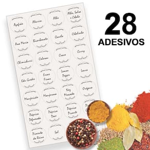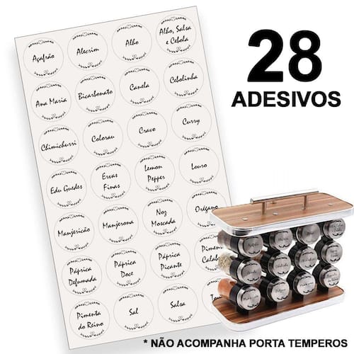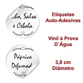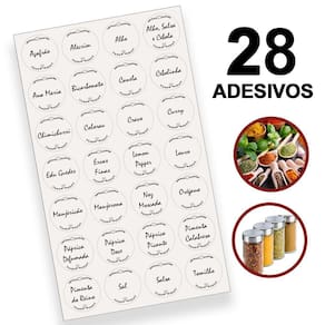 Feito em vinil autoadesivado de altíssima qualidade, este kit com 28 etiquetas é resistente à água e se encaixa perfeitamente bem na maioria dos potes de porta temperos vendidos no mercado. Cada etiqueta tem 38 mm de diâmetro, o que permite acomodar bem nas tampas dos potes e permite também uma visualização perfeita do rótulo.