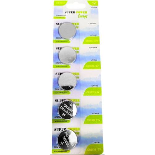 Especificações técnicas Pilha botão lithium cr2032- super power 3v A super power cr2032 é uma célula botão maior aproximadamente do tamanho de uma moeda , frequentemente encontrada em pequenos dispositivos eletrônicos - aplicação - de 3 meses a partir da data de recebimento do produto. - termos da - acompanha o produto 1 cartela cr2032 super power c/5 unidades Marca: Não Informado Ean: 1040000100019