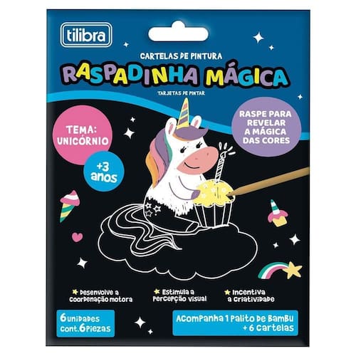 A raspadinha mágica oferece uma maneira curiosa e divertida de pintar, incentivando a coordenação motora, a percepção visual e a criatividade. Este produto, com temática de unicórnio, é indicado para crianças a partir de 3 anos. São 6 cartelas pretas, no formato 148x210mm, que ao serem raspadas com o palito de bambu incluso, revelam cores vibrantes. Produto certificado inmetro brinquedos/segurança - atenção: imagem meramente ilustrativa. Pode ocorrer mudanças no tom da cor para o produto real ou mudanças na embalagem sem aviso prévio por parte do fornecedor/fabricante. Homologação Inmetro: CE-BRI/IQB 005608 54346/21-022 Marca: Não Informado