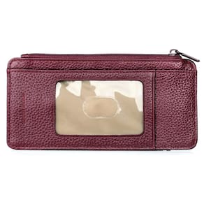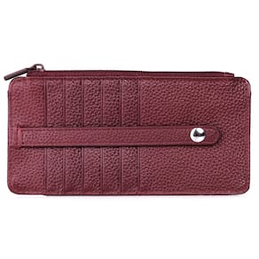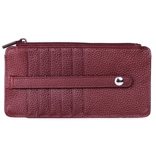 Porta tarjetas delgado Hudson Julia Buxton USA en cuero suave tipo mantequilla natural, con una tira a presión que asegura 6 ranuras para tarjetas de crédito, amplio bolsillo exterior y ventana para identificación, además de cierre superior completo para mayor seguridad.